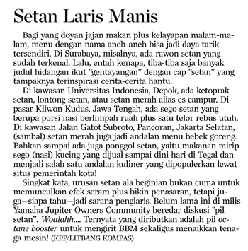 Sebuah berita menggelitik saya baca di koran sebelah. Di sana tertulis bahwa sekarang sedang musim serba setan. Ada rawon setan, ketoprak setan, lontong setan, pil setan, dan seterusnya.