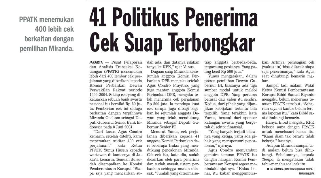 Saya heran, mereka itu pura-pura buta atau memang tuli ya? Sudah jelas-jelas bahwa Pusat Pelaporan dan Analisa Keuangan mempunyai daftar nama para penerima cek, kok ya mereka itu ndak segera maju. Ngaku. “Ya, saya ikut menerima cek itu.”