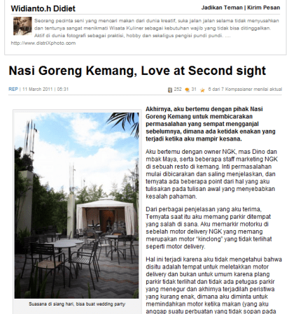 Widianto.h Didiet, seorang bloger, membuat review kuliner tentang sajian dan pelayanan Nasi Goreng Kemang. Review itu rupanya berbuntut panjang, ketika blog Didit dikomentari ratusan orang. Selain itu percakapan di twitter pun sempat seru antara @Widianto_Didietdengan @NGKemang, yang ditimpali komentar dan retwit oleh para followernya.